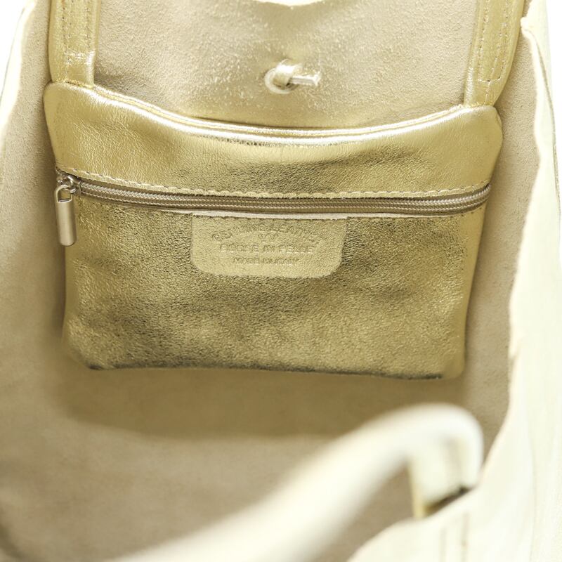 何かと使いやすいイタリ牛革のトートバッグでキラキラのゴールドです。荷物をぽんと入れて、荷物の重さをきにする事なく、過ごせます。中にポシェット型のポケットがついて、小物の整理にも困りません。